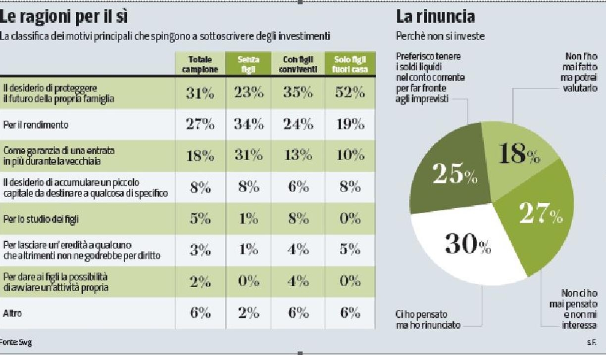 In Italia c’è un divario di consapevolezza, netto e crescente, tra i risparmiatori che hanno già sottoscritto prodotti d’investimento e quelli che ne sono totalmente estranei. Le preoccupazioni per il futuro sono le medesime, a cominciare dalle pensioni. Secondo una ricerca condotta da Swg per Cnp Partners su un campione di mille individui di età compresa tra 35 e 70 anni, che sarà presentata in occasione del Salone del Risparmio e di cui L’Economia è in grado di anticipare alcuni risultati, l’81% dei rispondenti teme che il futuro assegno dell’Inps possa essere insufficiente, il 78% di essere colpito da un evento capace di mettere in difficoltà economiche la propria famiglia e il 73% di non riuscire a mantenere l’attuale tenore di vita. I timori Il senso di inadeguatezza, però, aumenta tra coloro che non possiedono alcun prodotto d’investimento. E soprattutto il modo differente di affrontare l’incertezza espone a rischi maggiori proprio chi è meno attrezzato dal punto di vista finanziario a gestire eventuali imprevisti in grado di stravolgere la capacità della famiglia di generare reddito e quindi far fronte alle spese future. Da una parte, chi frequenta il mondo degli investimenti mostra una certa coerenza tra le motivazioni dell’investimento — il desiderio di proteggere il futuro della famiglia (31%), di ottenere un rendimento più appetibile rispetto alla remunerazione del conto corrente (27%), o di garantirsi un’entrata aggiuntiva che lo metta nelle condizioni di godersi la vecchiaia (18%) — e le caratteristiche dei prodotti su cui preferisce investire: orientati in prevalenza, dice la ricerca, alla protezione del capitale (27%), del reddito (18%), e alla fruizione di una rendita periodica (18%). Dall’altra, le ragioni di chi non investe testimoniano una grave incompetenza in materia: oltre la metà non ha mai pensato di sottoscrivere un prodotto d’investimento, il 27% perché dichiara di «non essere interessato», mentre il 25% preferisce «tenere i soldi liquidi sul conto per far fronte a potenziali imprevisti come malattia o perdita di lavoro». Punti di vista «È un approccio scorretto. Con il giusto supporto consulenziale, si possono aiutare i risparmiatori a proteggersi dai rischi in modo molto più efficiente, senza immobilizzare somme significative e mettendoli quindi nelle condizioni di destinare maggiori risorse a eventuali prodotti d’investimento, in ottica di crescita del capitale o integrazione del reddito», spiega Francesco Fiumanò, responsabile commerciale di Cnp Partners in Italia. Al tempo stesso, osserva Fiumanò, c’è ampio spazio per accrescere la cultura finanziaria di chi già investe. Basti pensare che, secondo la ricerca di Swg, il 70% preferisce gestire personalmente i propri investimenti e tra chi possiede almeno un prodotto, il 64% non si avvale della consulenza di un professionista del settore. Quattro intervistati su dieci invece si confrontano con l’avvocato o il notaio, più o meno regolarmente, per avere qualche suggerimento a proposito di questioni finanziarie.